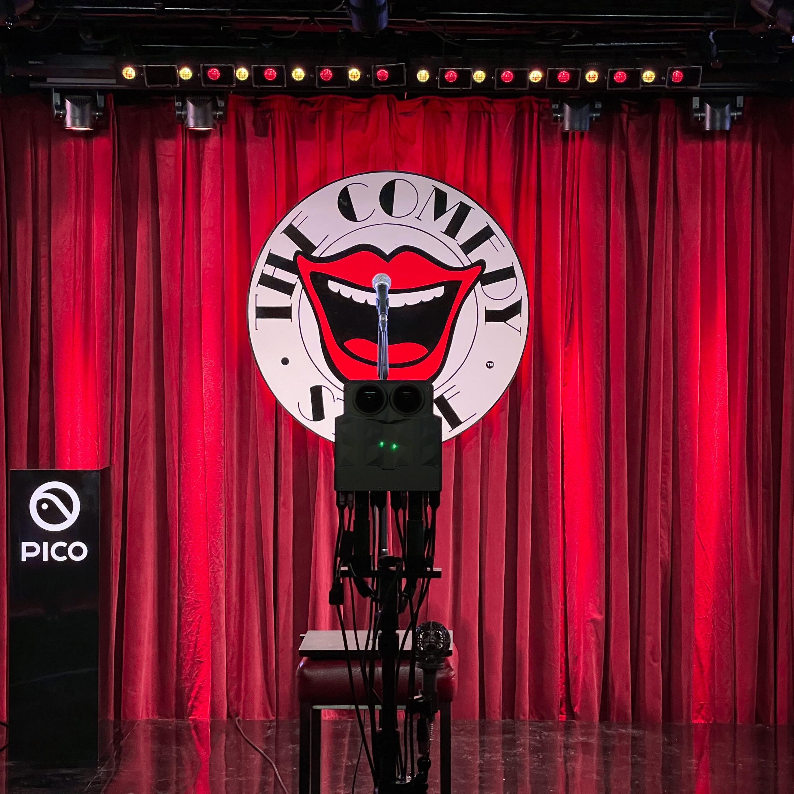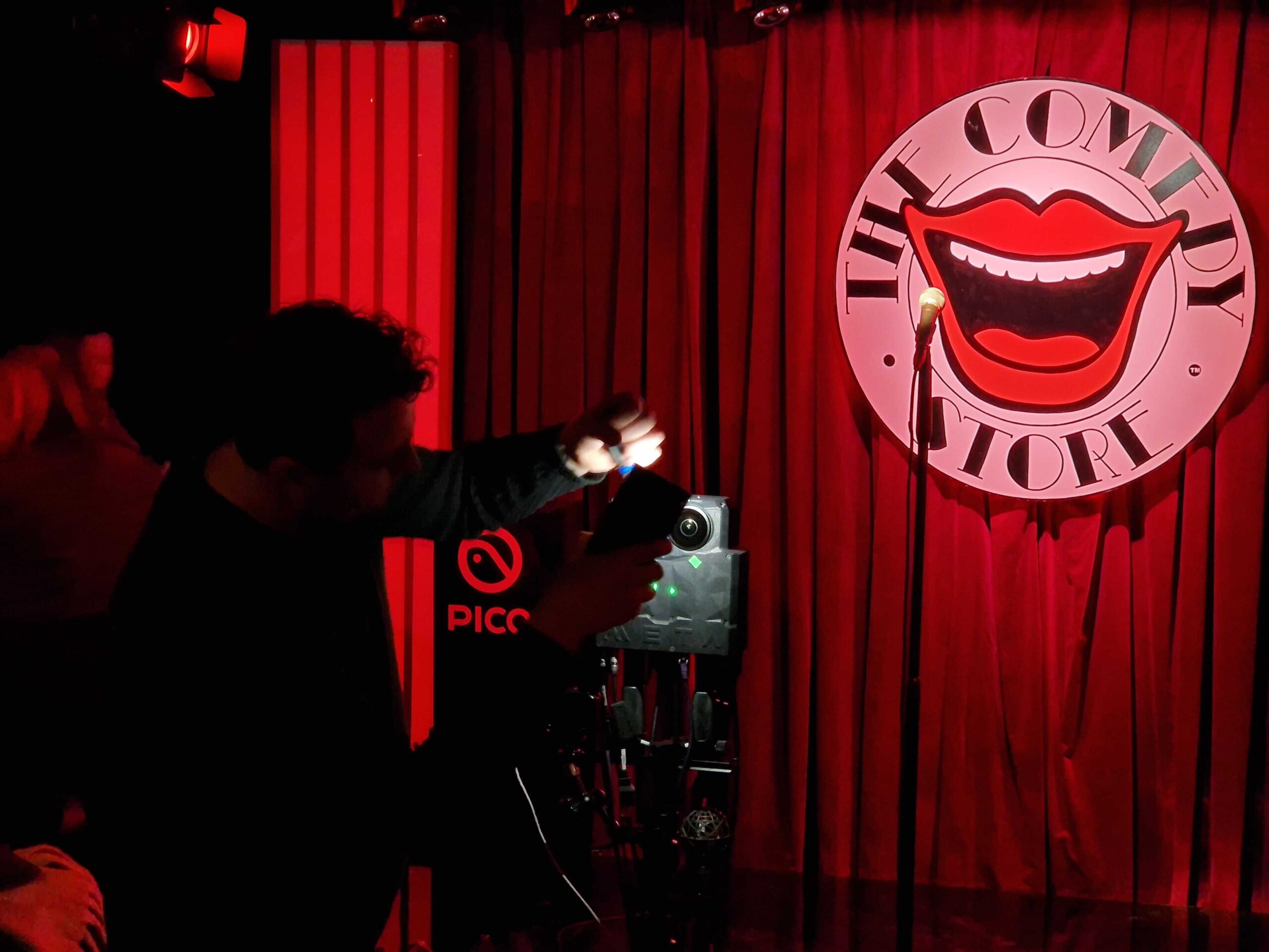 We were given the tough challenge of live VR streaming a series of comedy gigs in the dark basement of the Comedy Store in London. The streams had to be 3D - so we built this custom camera system to capture perfect 3D of the stage looking forwards and the audience looking back.